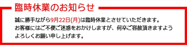 休業期間中のご注文につきましては翌営業日となる9月24日(水)より順次出荷とさせて頂きますので、休業期間中は皆様にご不便ご迷惑をおかけいたしますが何卒ご容赦頂きますよう、宜しくお願い申し上げます。